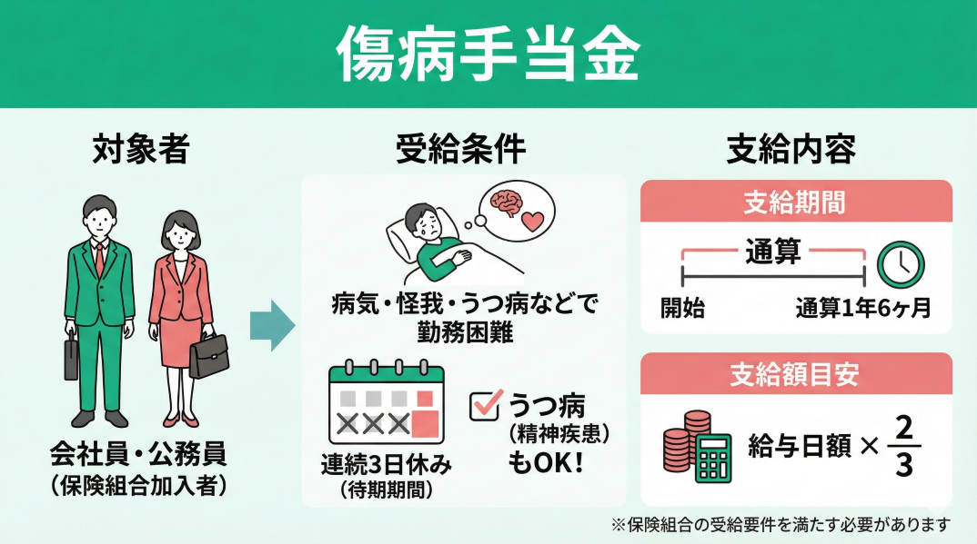 うつ病に役立つ公的保障の1つ目は「傷病手当金」です。
