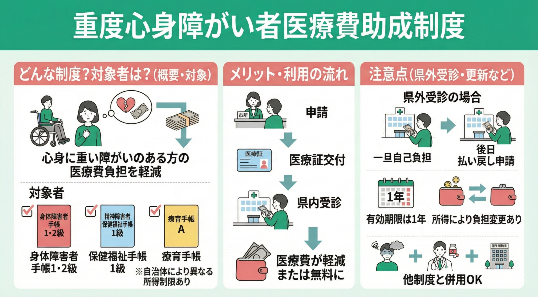 重度心身障がい者医療費助成制度とは、心身に重い障がいがあるかたの医療費を軽減するための制度です。自治体が定める疾病に対し利用できます。