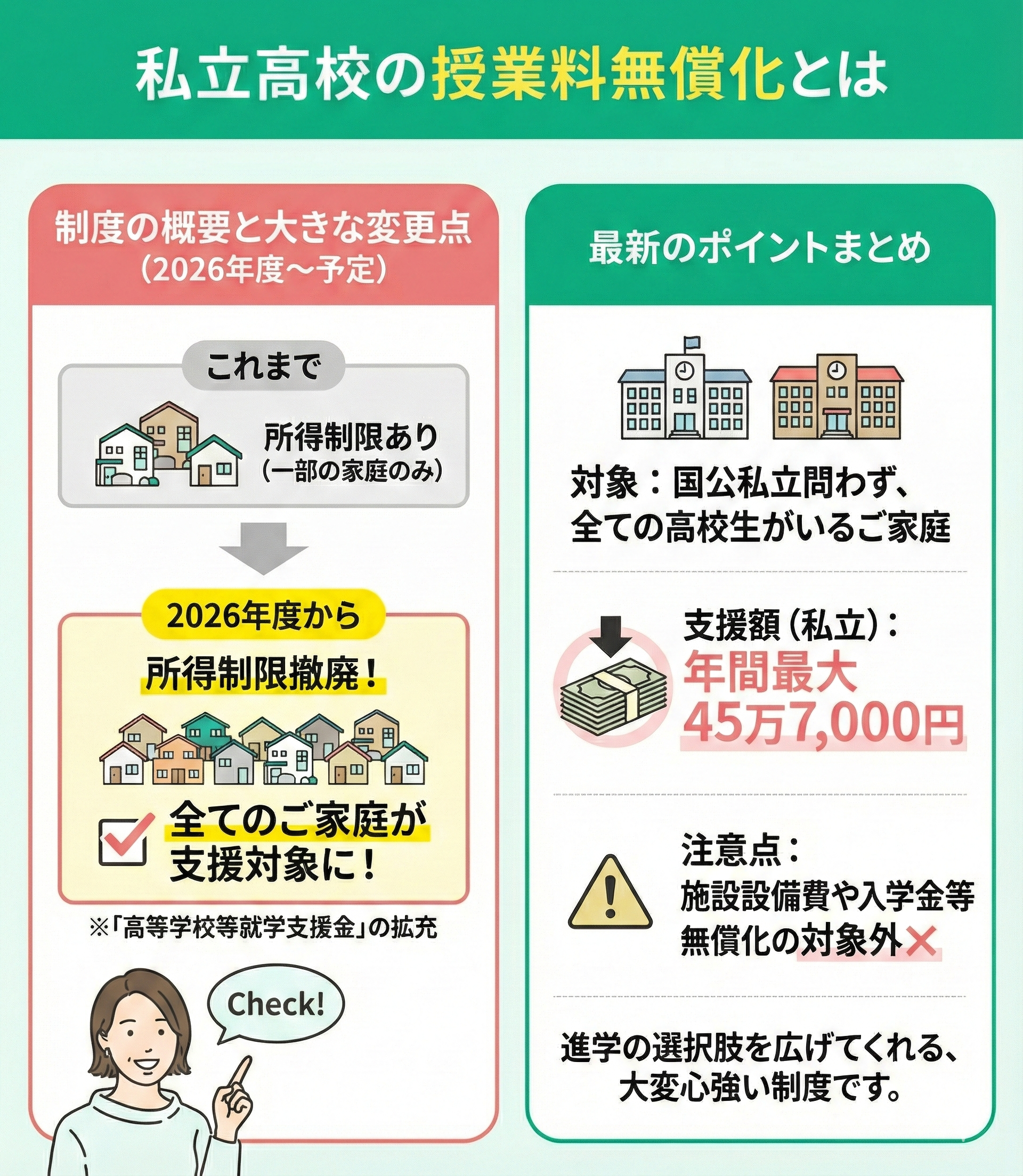 2026年現在、国の「高等学校等就学支援金」の所得制限は完全撤廃されました。そのため、世帯年収や家族構成に関わらず、私立高校に通うすべての生徒が年間最大45万7,000円の支援対象となります。