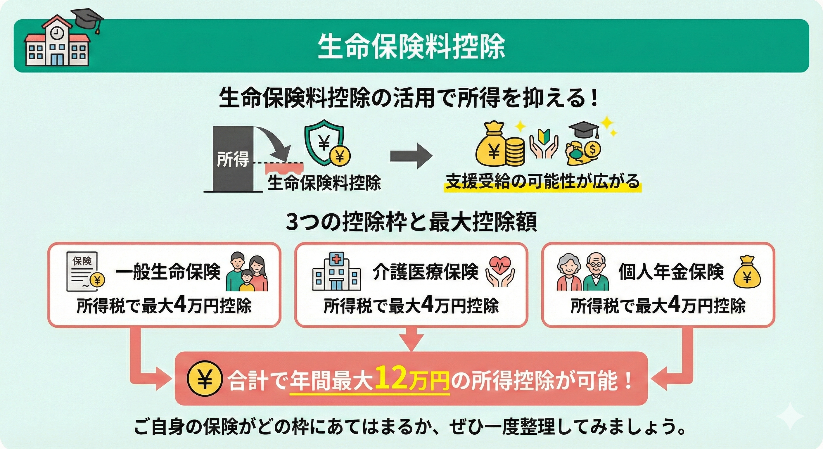 控除には「一般生命保険」「介護医療保険」「個人年金保険」の3つの枠があり、それぞれ所得税で最大4万円、合計で年間最大12万円の所得控除が可能です。