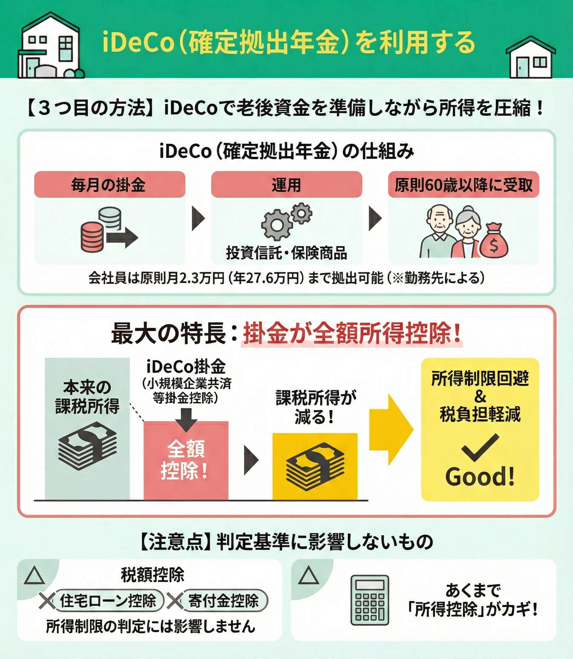 会社員は原則として月2.3万円(年27.6万円)まで拠出できます(※勤務先制度により異なる)。税負担を抑えながら老後資金を準備でき、所得制限の回避にも有効です。