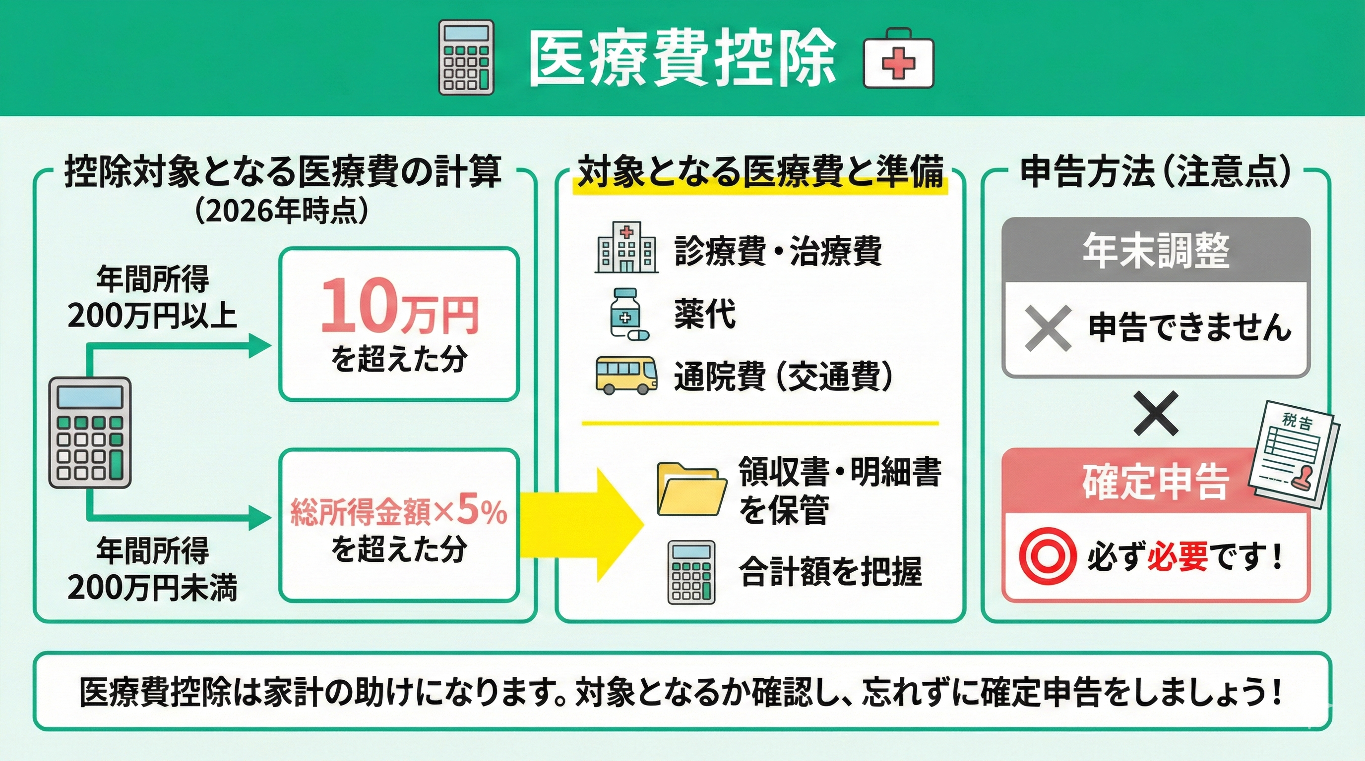 医療費控除は、実際に支払った医療費の合計額から「保険金などで補てんされる金額」を差し引いた上で、年間所得が200万円以上の方は10万円、200万円未満の方は「総所得金額等×5%」を超えた分が控除対象(上限200万円)となります(2026年時点)。
