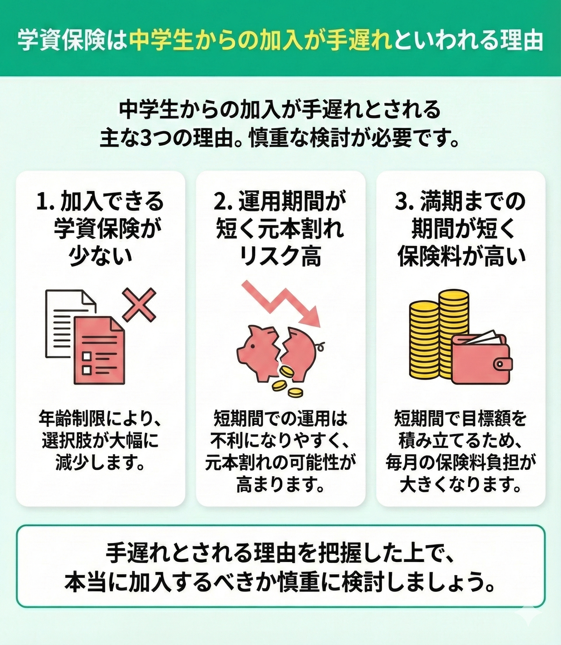 - 中学生から学資保険に加入するのが手遅れといわれる理由は以下の3つがある