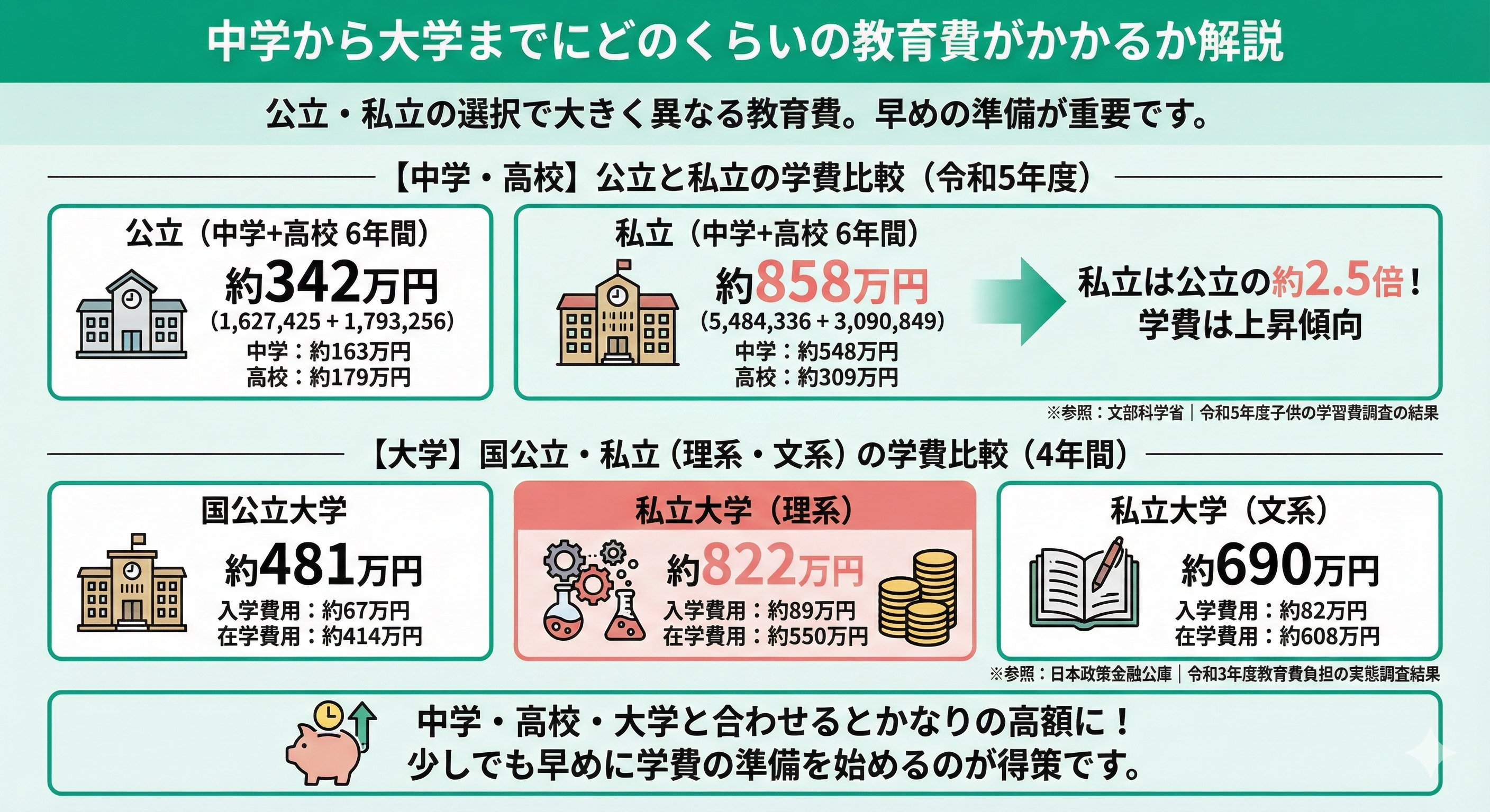 中学から大学までにかかる教育費用は、公立・私立のどちらを選択するかによって大きく異なります。