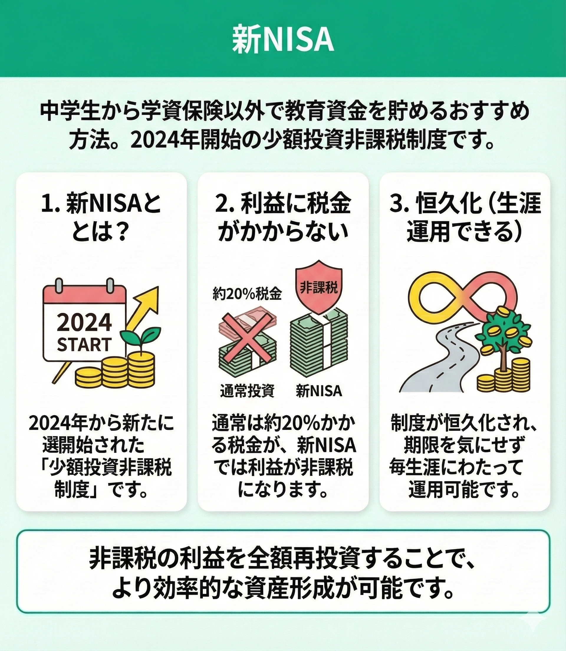 中学生から学資保険以外で教育資金を貯めるおすすめ方法の1つめは、新NISAで資産運用することです。