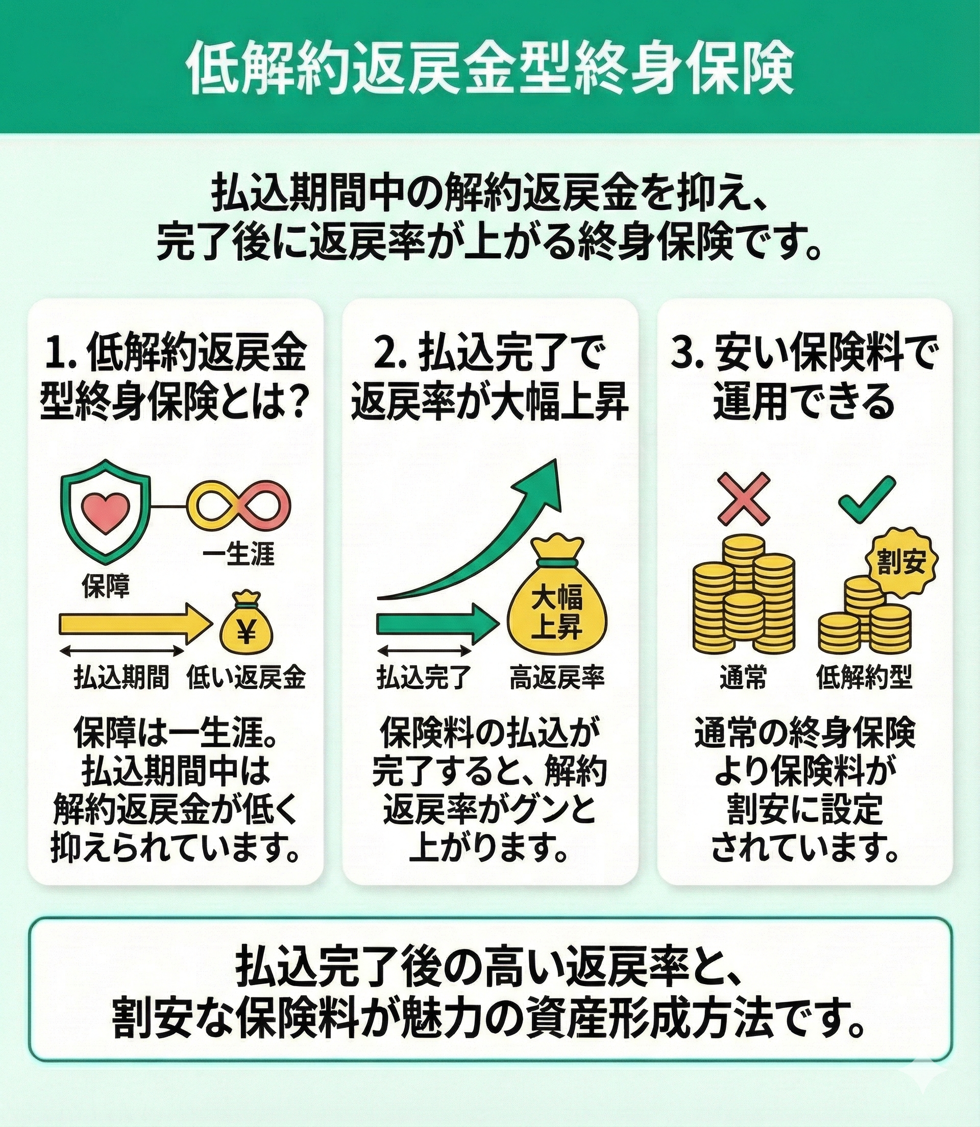 低解約返戻金型終身保険は、死亡や高度障害などの保障が一生涯続く終身保険で、保険料払込期間中の解約返戻金の水準が低く抑えられている特徴があります。