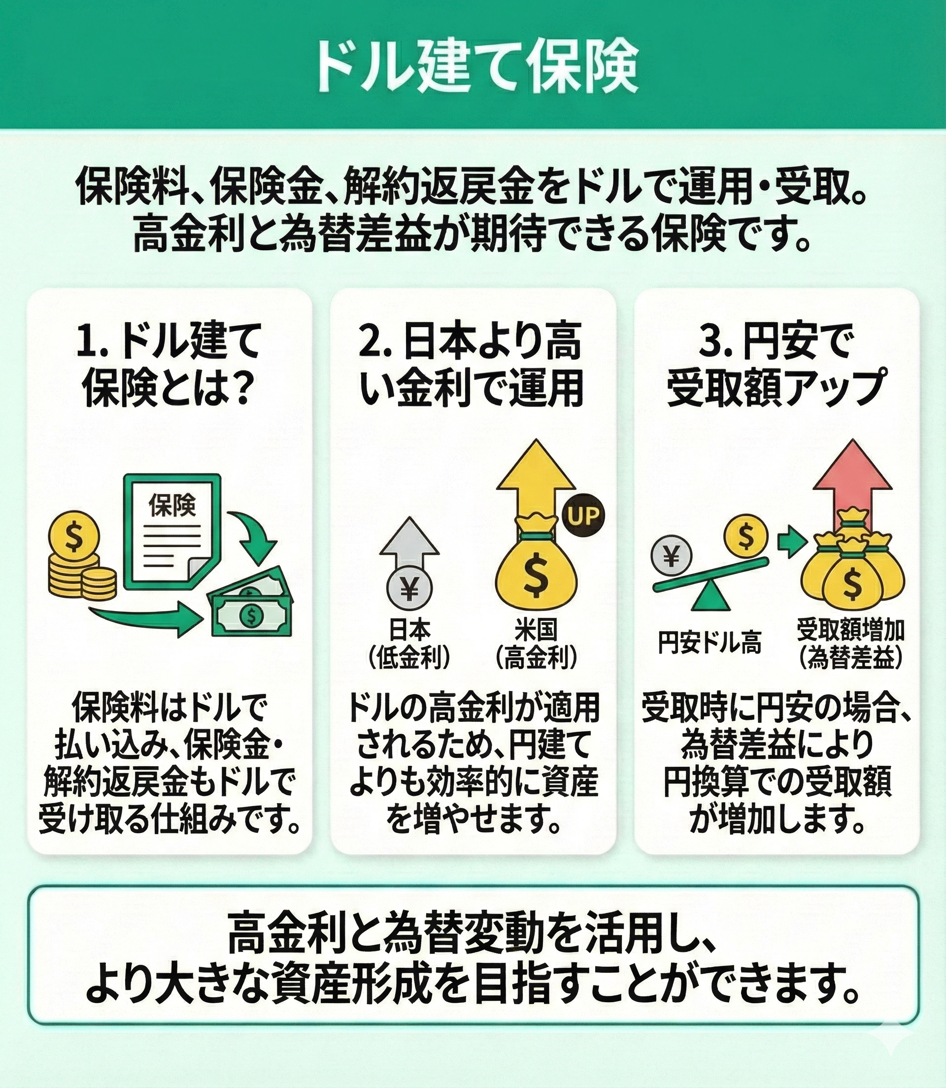 ドル建て保険は、保険料をドルで払い込み、保険金や解約返戻金などもドルで受け取る保険のことです。