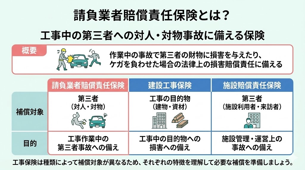 工事保険の1つである「請負業者賠償責任保険」は、対人・物損保険として第三者に対する損害賠償を補償する保険であり、建設工事保険などとは補償する内容が異なります。
