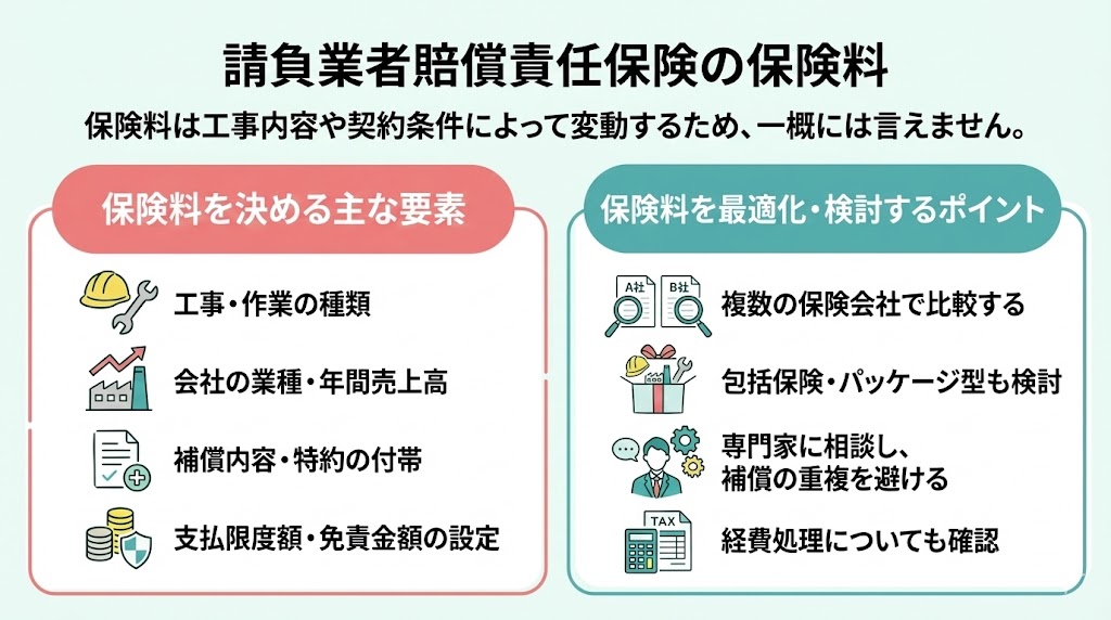 - 基本補償で不足するリスクへの備えは特約の付帯で補償を拡大できるが、工事や作業内容・業種・契約方式によって保険料は異なる。