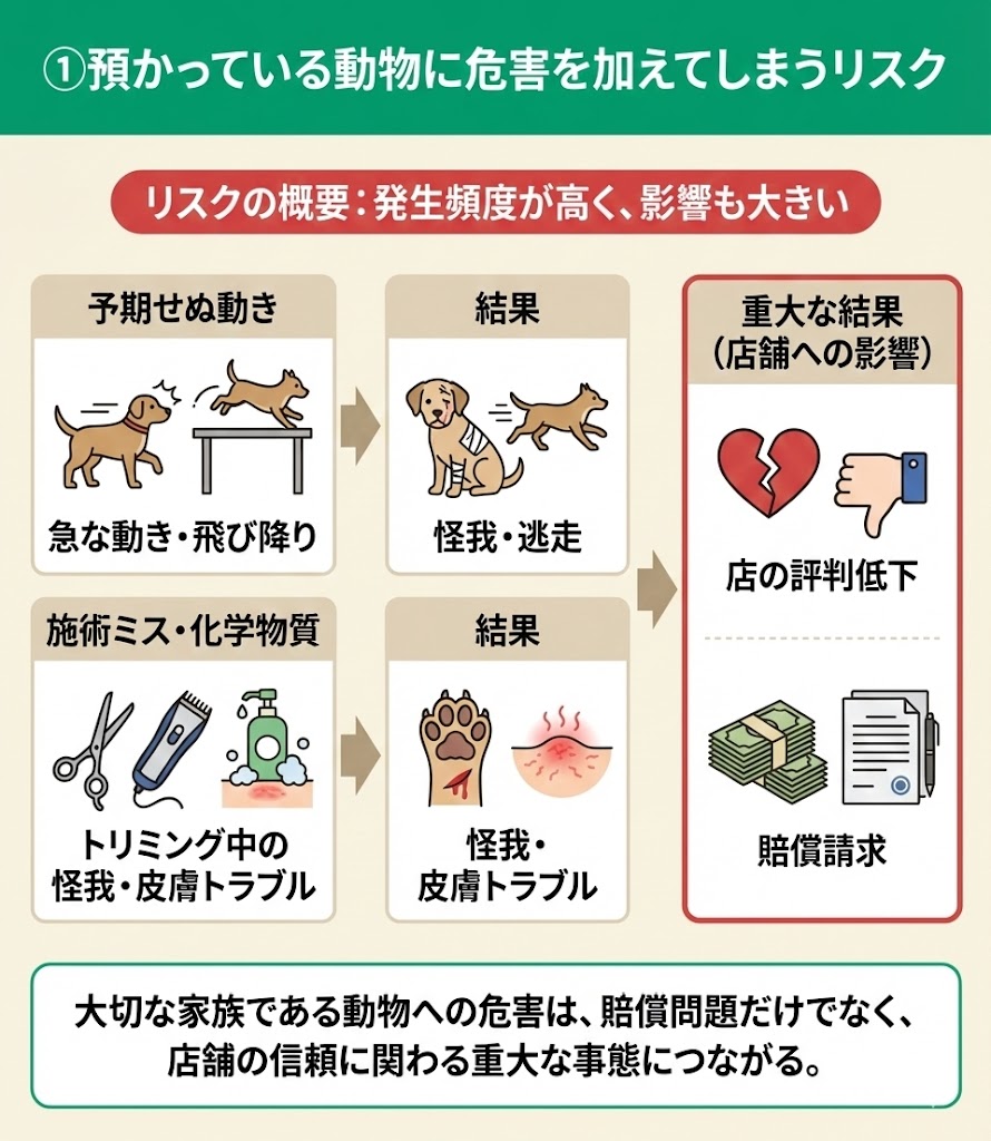 - ①預かっている動物に危害を加えてしまうリスク