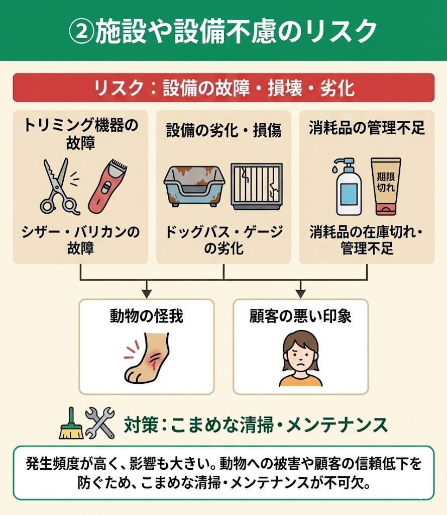 ペットサロン内の設備などが故障したり損壊するリスクは、発生頻度も高く、影響も大きいリスクです。