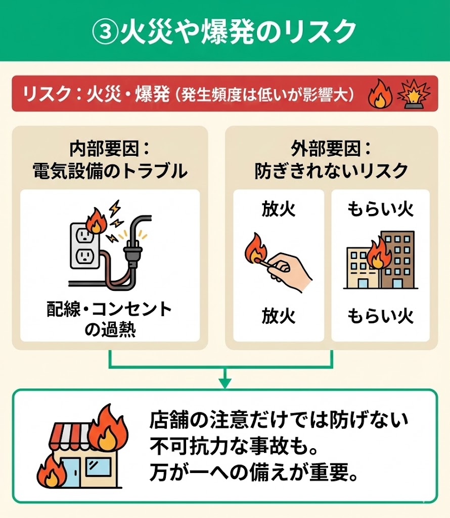 店舗内で火を使用することはほとんどない一方、電気設備のトラブル(配線・コンセントの過熱など)や、放火など店舗側だけでは防ぎきれない要因もあります。