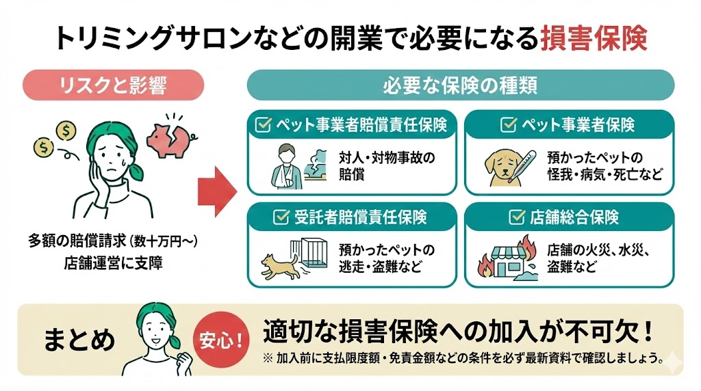 結論、トリミングサロンの保険は、ペットに関する賠償(預かり中のケガ・逃走など)と、店舗運営の賠償・財物(来店客の事故、火災・水濡れ等)を分けて備えることが重要です。