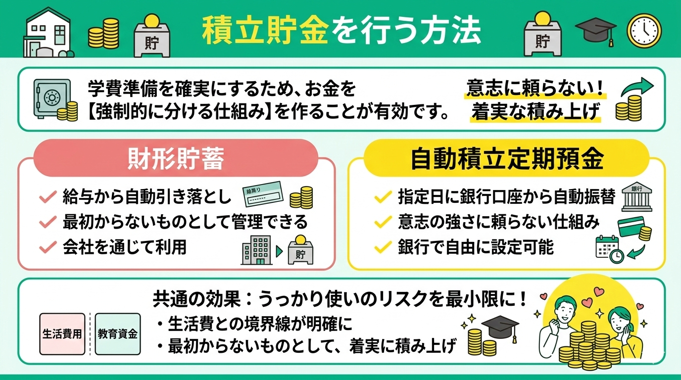 学費準備をより確実なものにするためには、積立貯金を仕組み化して取り入れることが有効な手段となります。