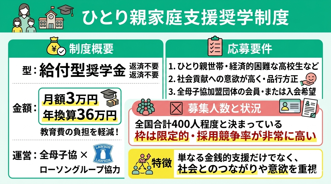 ひとり親家庭支援奨学制度は、一般財団法人全国母子寡婦福祉団体協議会(全母子協)とローソングループが協力して運営している給付型の奨学金です。採用されると、返済の必要がない給付金として月額3万円が支給されます。