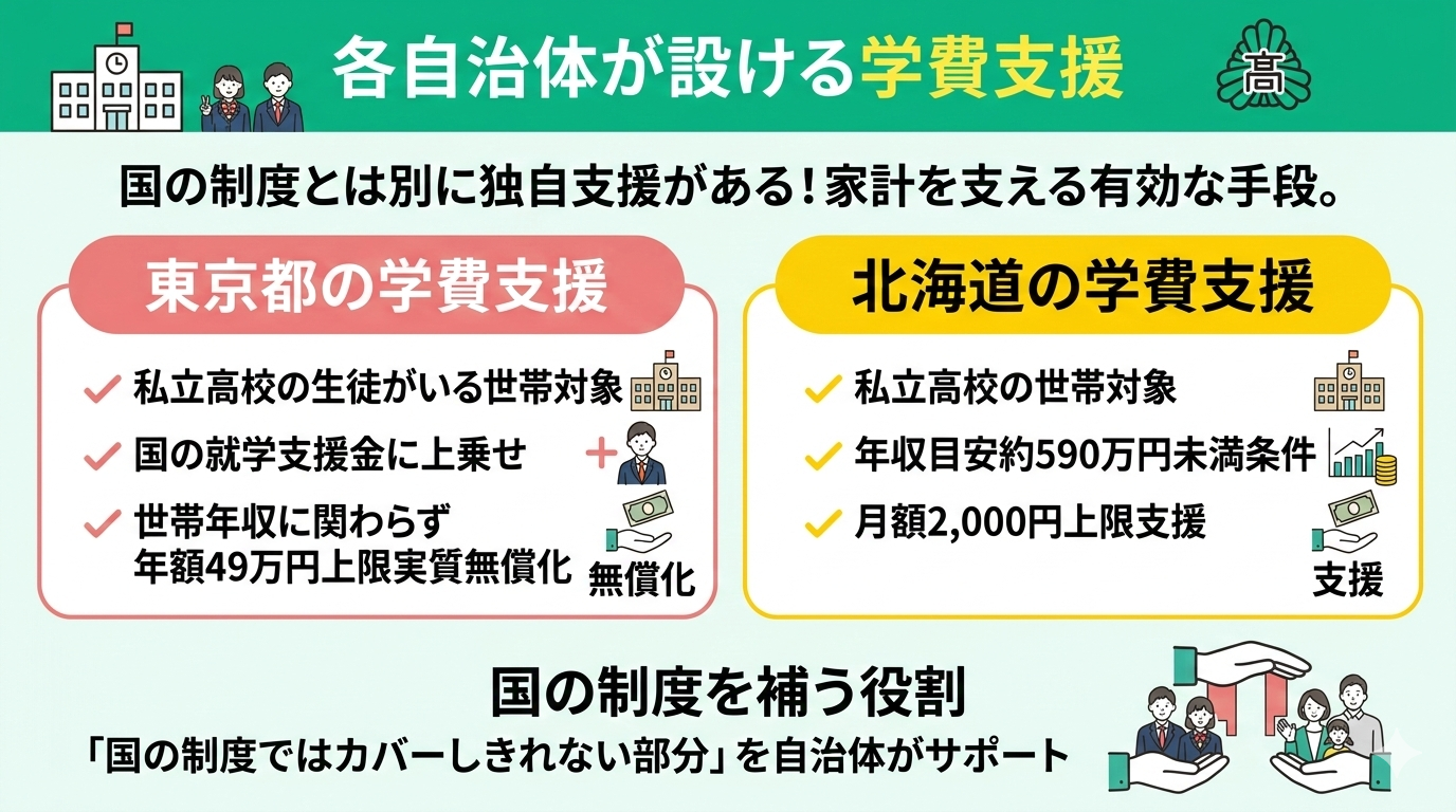 国が実施する制度とは別に、各自治体が独自に設けている学費支援も、家計を支える有効な手段です。