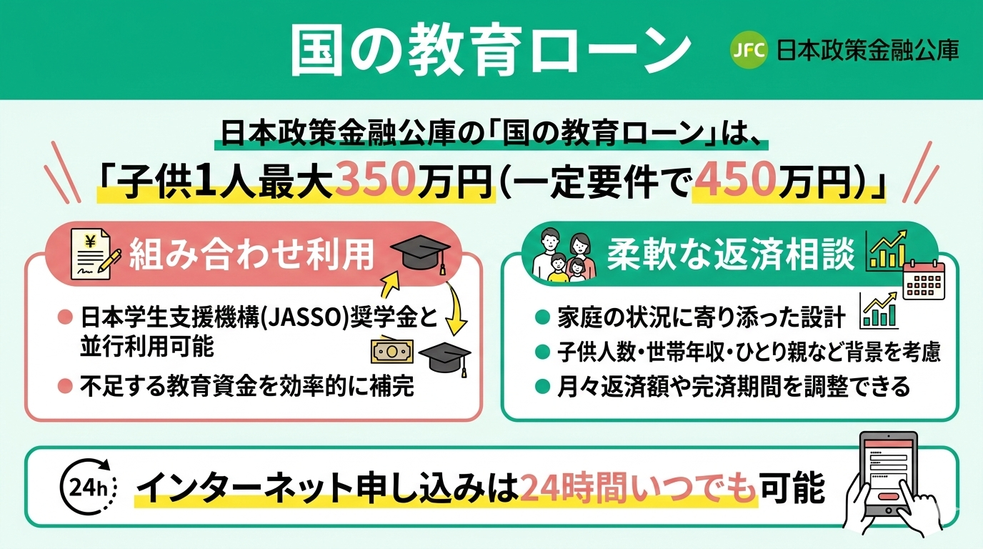日本政策金融公庫が取り扱う「国の教育ローン」は、子供1人につき最大350万円(一定の要件を満たす場合は450万円)まで融資を受けられる制度です。