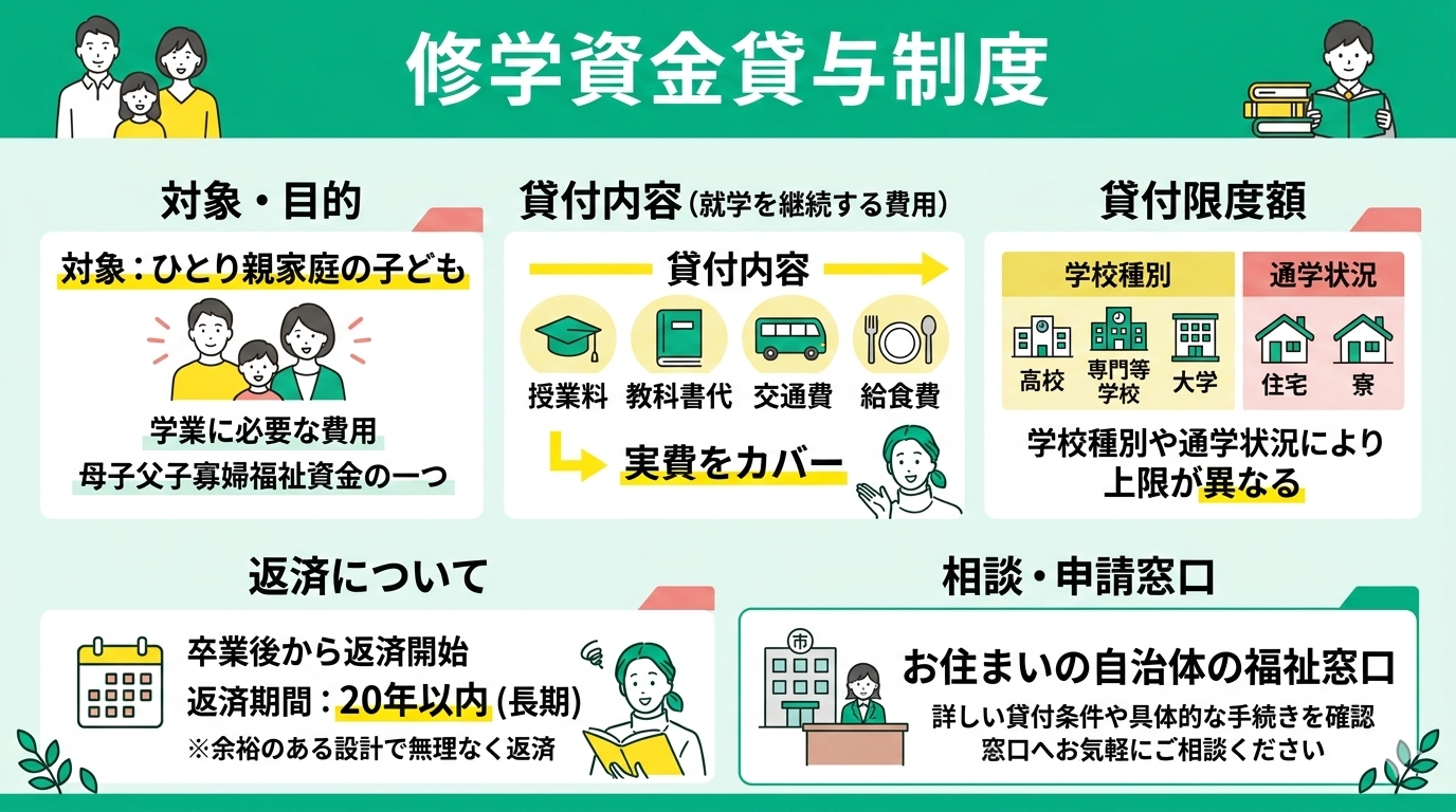 この制度も、前述した「母子父子寡婦福祉資金」の一つで、ひとり親家庭の子どもが高校などで学ぶために必要な費用を貸し付けるものです。
