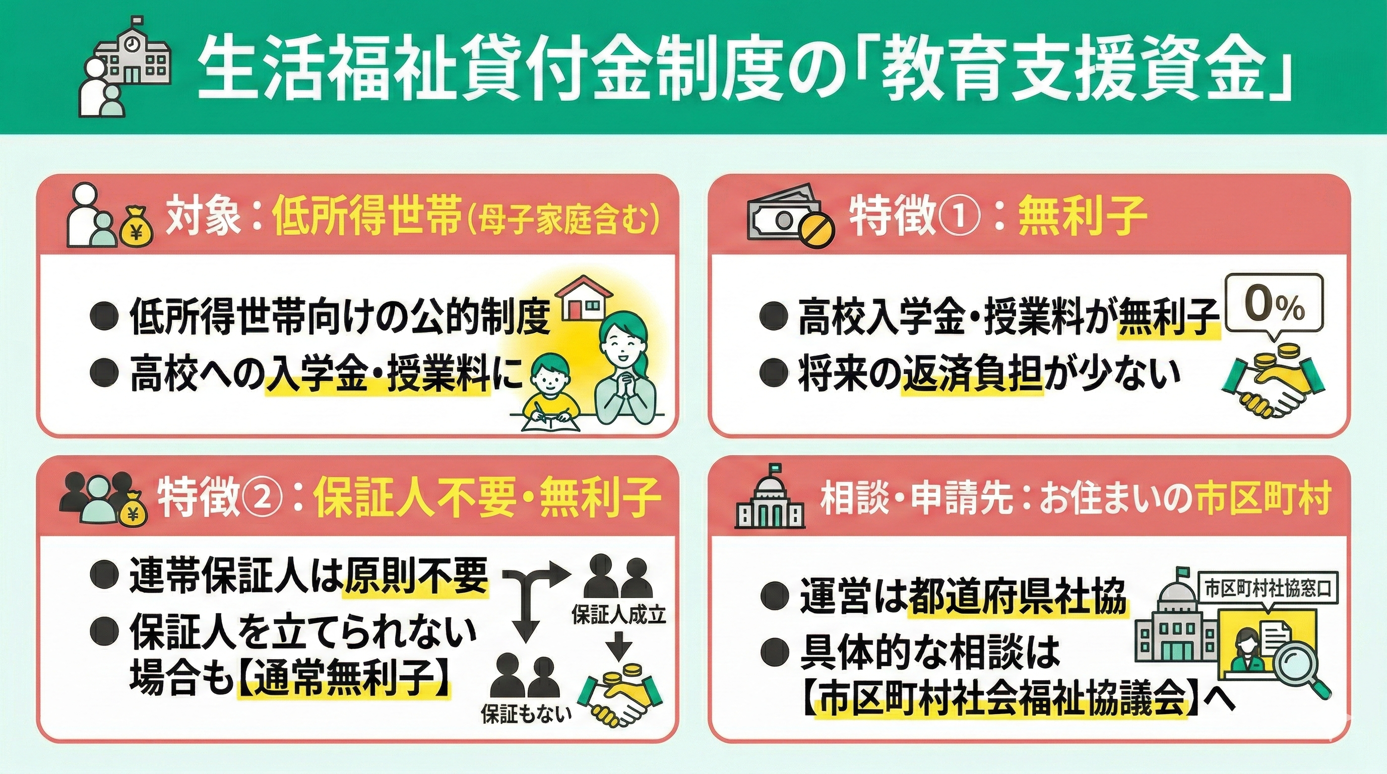 連帯保証人については、原則として立てる必要はありません。保証人を立てる場合はもちろん無利子ですが、立てられない場合でも、教育支援資金の枠組みであれば無利子で利用できることが一般的です。