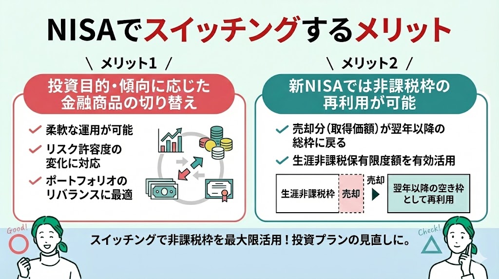 NISAでスイッチングをするメリットの1つめは、投資の目的やリスク許容度の変化に合わせて金融商品の切り替えができることです。