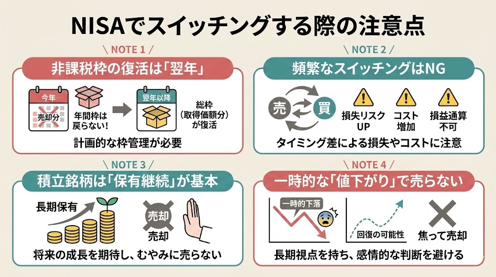 頻繁にスイッチングを行うと、その年の年間投資枠を早く使い切ってしまい、買い直しがしにくくなる場合があります。行う際は、枠の計算まで含めて計画を慎重に立てることが大切です。