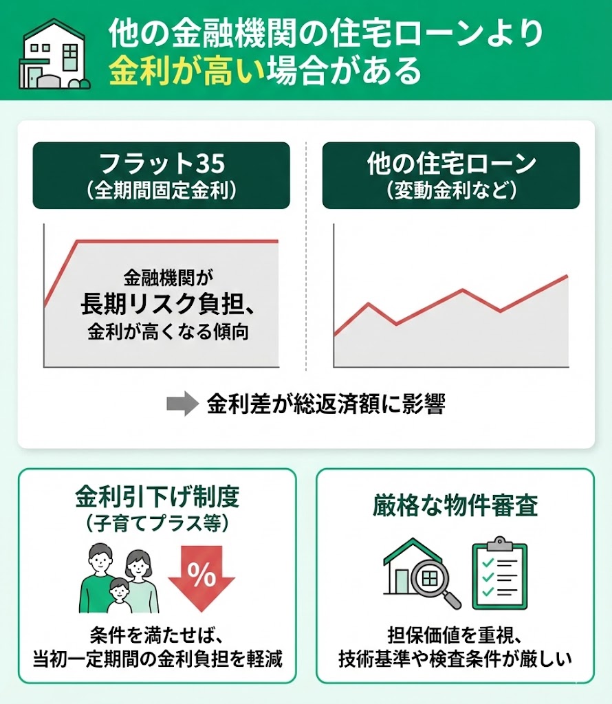 フラット35は全期間固定金利型住宅ローンのため、市場金利の動向によっては変動金利や短期固定金利と比較して金利水準が高く設定される傾向があります。