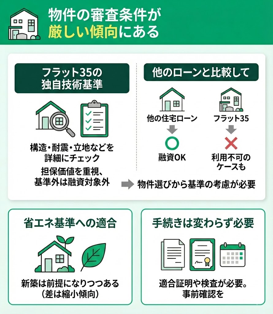 フラット35では、融資対象物件に対して独自の技術基準が設けられており、これが他の住宅ローンと比較して審査を困難にする要因となっています。