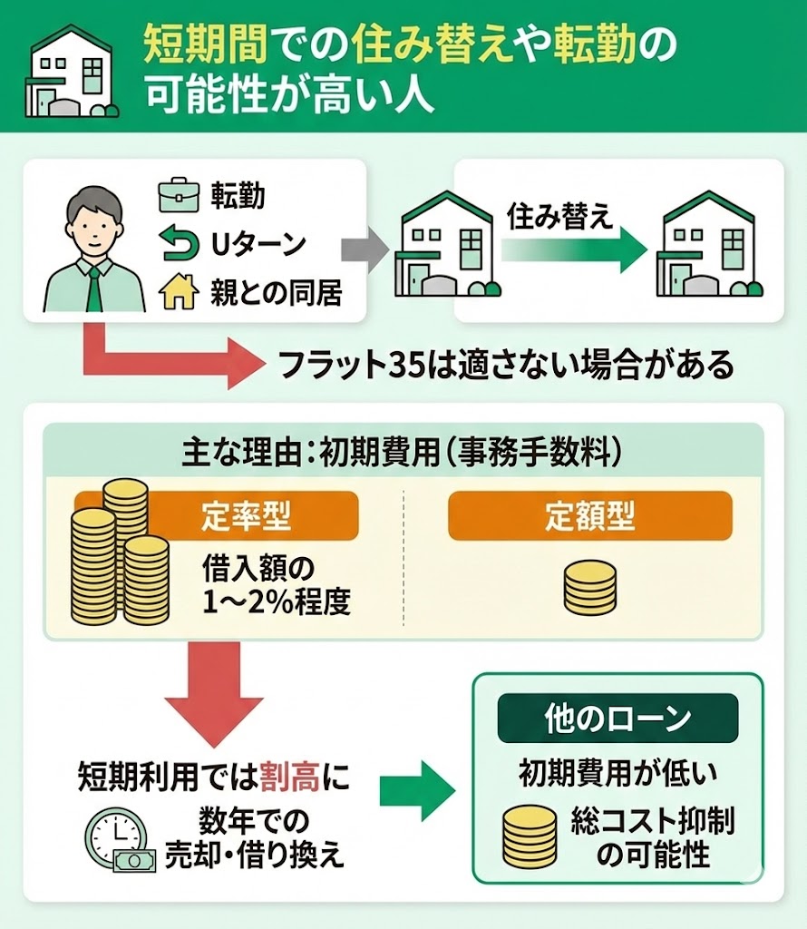 近い将来に転勤やUターン、親との同居などで住み替えの可能性がある人も、フラット35は適さない場合があります。