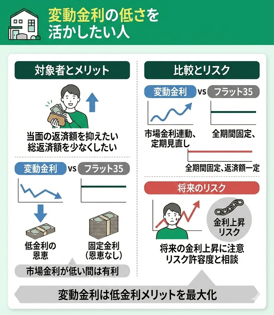 そのため、固定金利の「安心」を優先するよりも、当面の金利の低さを重視して総返済額を抑えたい場合は、フラット35より変動金利のほうが合うケースがあります。