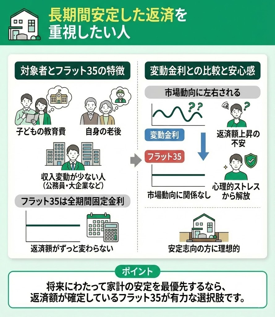子どもの教育費がかかる時期や、自身の老後など、将来にわたって家計収支の安定性を重視したい人には、フラット35が有力な選択肢となります。