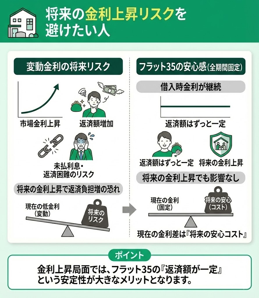 現在の金利水準が変動金利より高くても、将来の安心をコストとして受け入れる考え方の人には、フラット35が適しています。