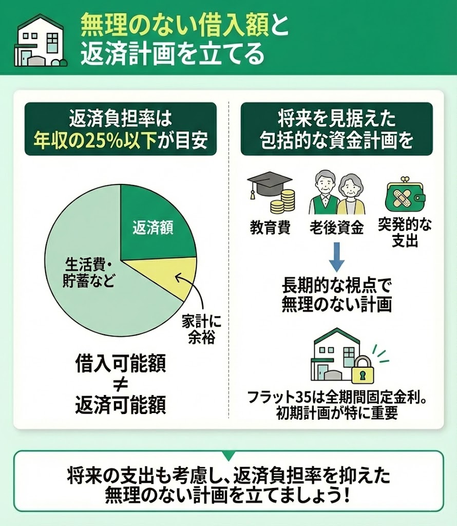 特にフラット35は全期間固定金利のため、返済額の変動がない分、初期の計画が特に重要になります。