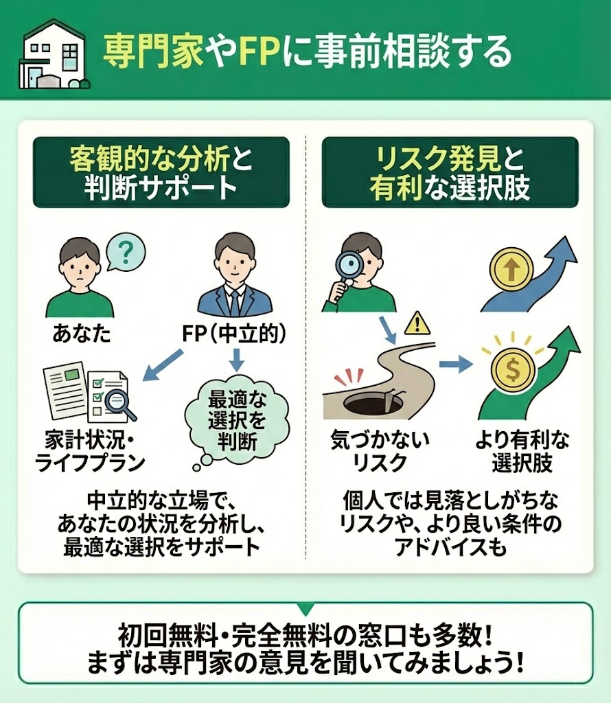 フラット35を利用するべきか自分で判断できない場合は、専門家やFPに事前相談するのがおすすめです。