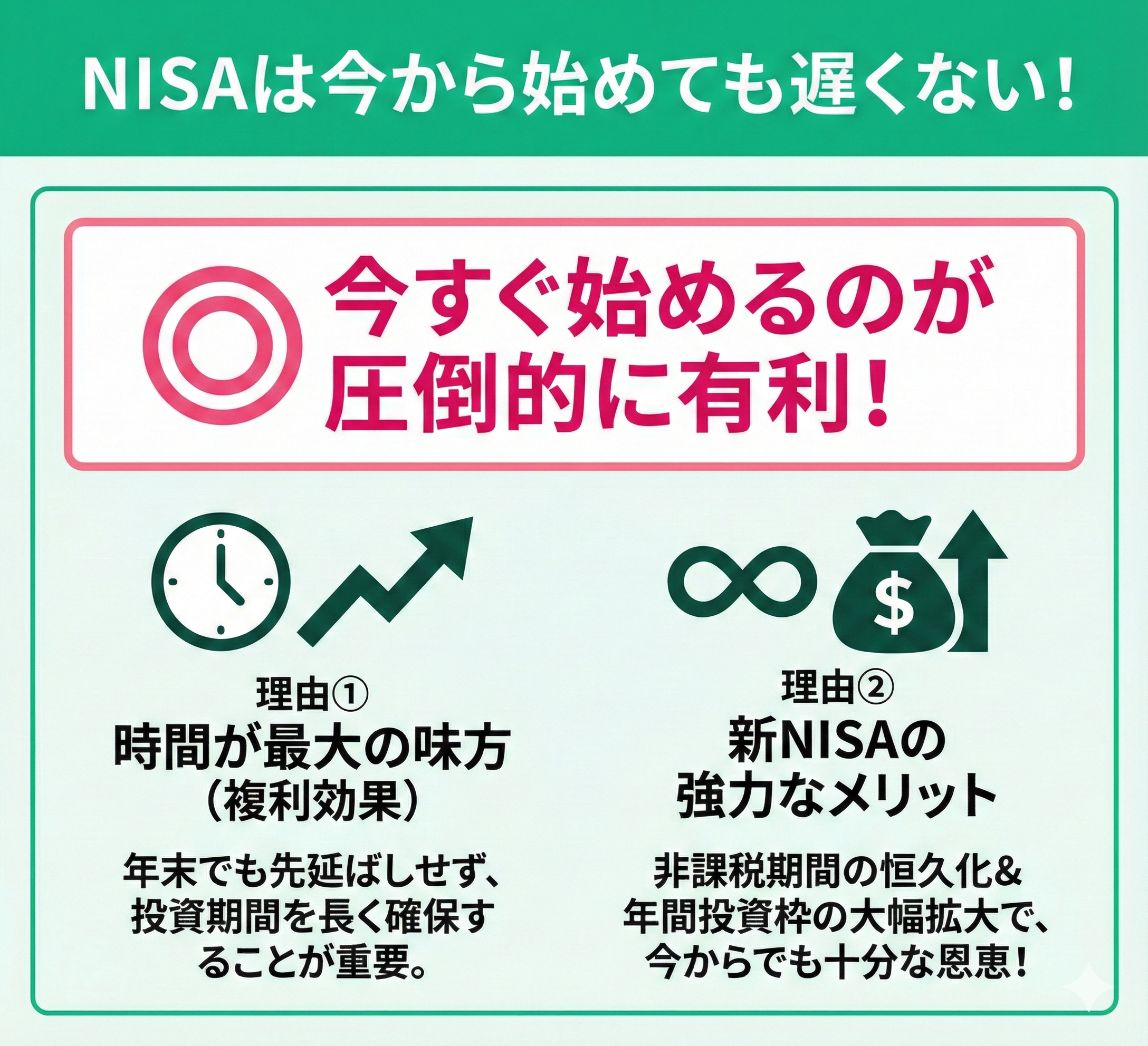 - 思い立った日が始め時:スタートを先延ばしにすると、時間を味方につける複利効果や非課税メリットを享受し損ねてしまいます。