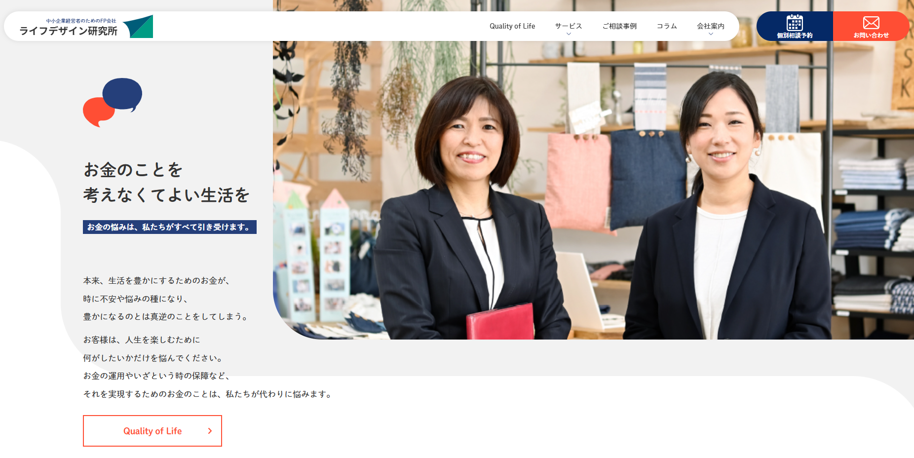 資産形成や保険、相続対策など、個人・法人を問わず幅広いお金の相談にワンストップで対応しています。「お金のことを考えなくてもよい生活(Quality of life)」の実現を理念に掲げ、お客様の人生に寄り添う包括的なサポートを提供しているのが大きな特徴です。