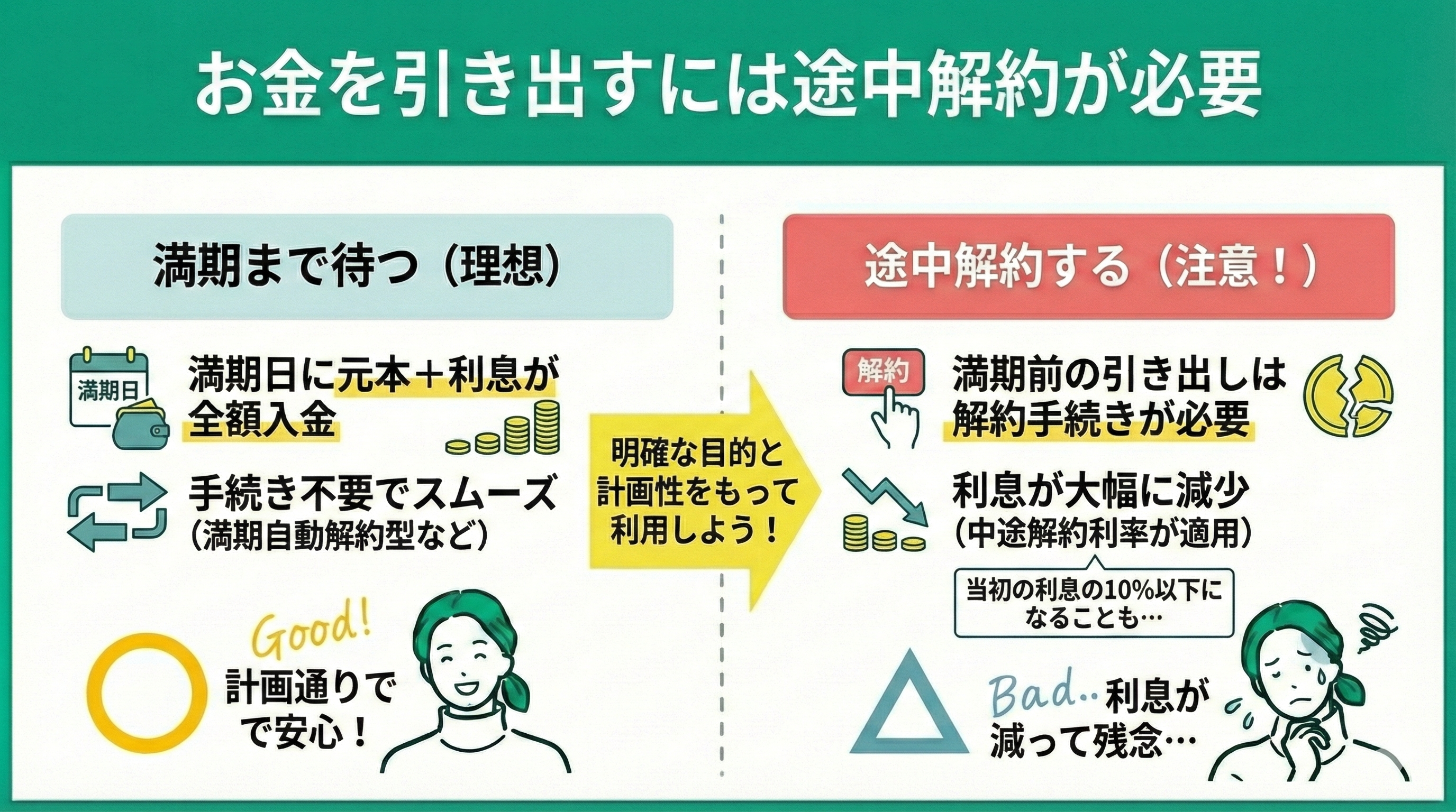しかし、満期日以外でお金を引き出すときは、解約手続きが必要となります。