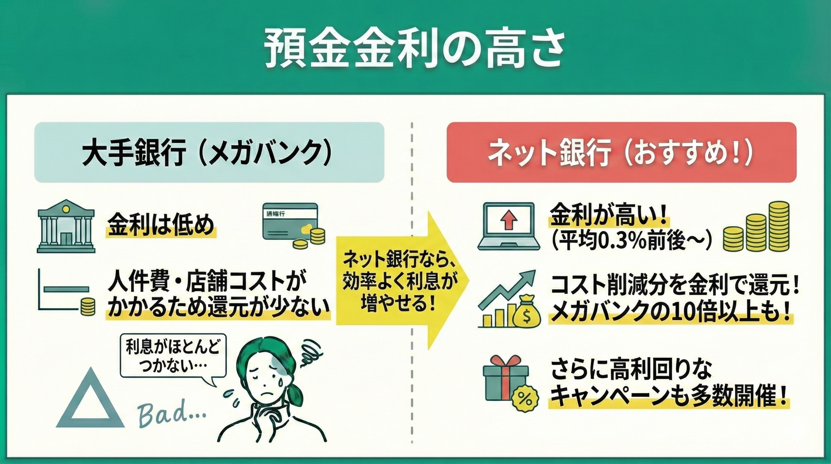 金利の高さは、大手の銀行よりもネット銀行のほうが人件費が少なくて済む分、還元される金利は高く設定されています。