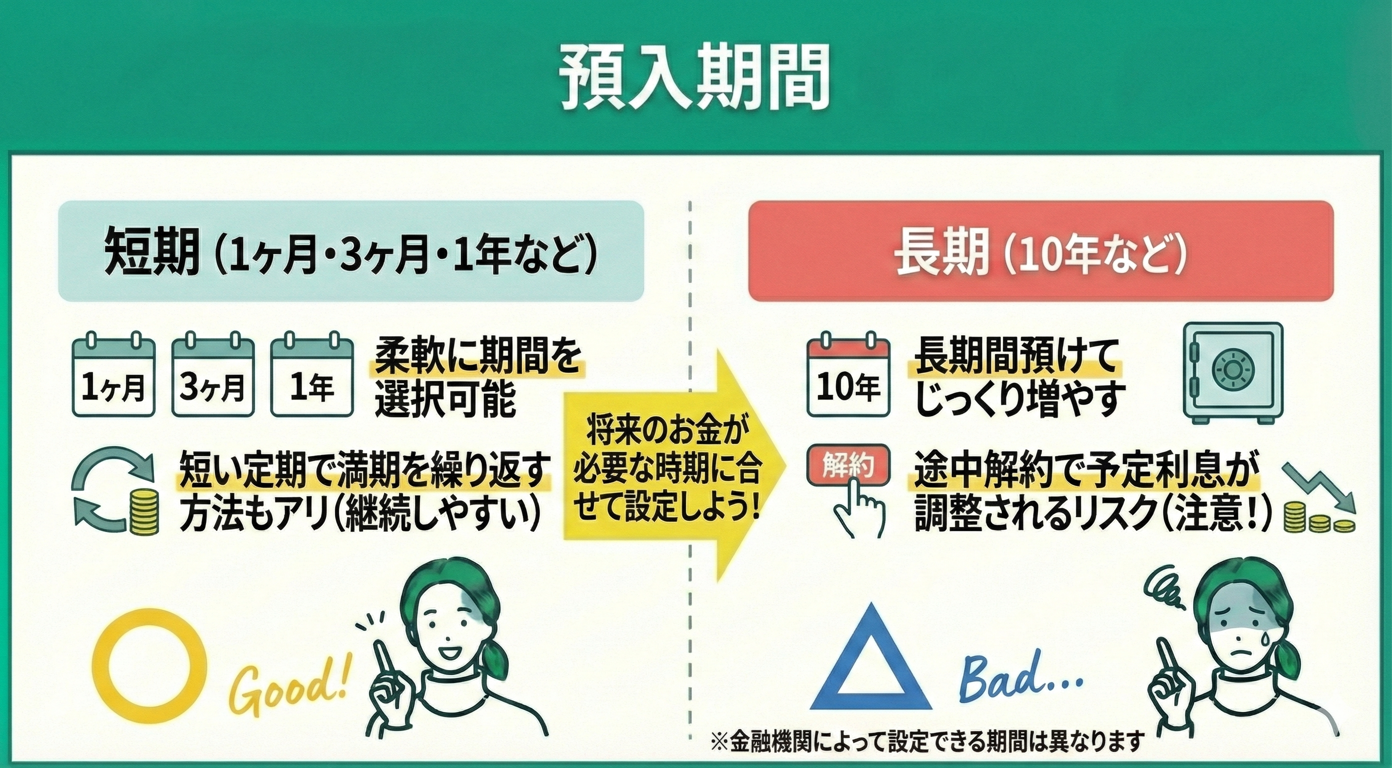 これまで、定期預金の特徴と、メリット、デメリットを解説しました。