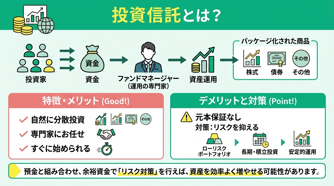投資信託とは、投資家から集めた大きな資金で「ファンドマネージャー」(運用の専門家)が資産を運用するしくみの金融商品です。