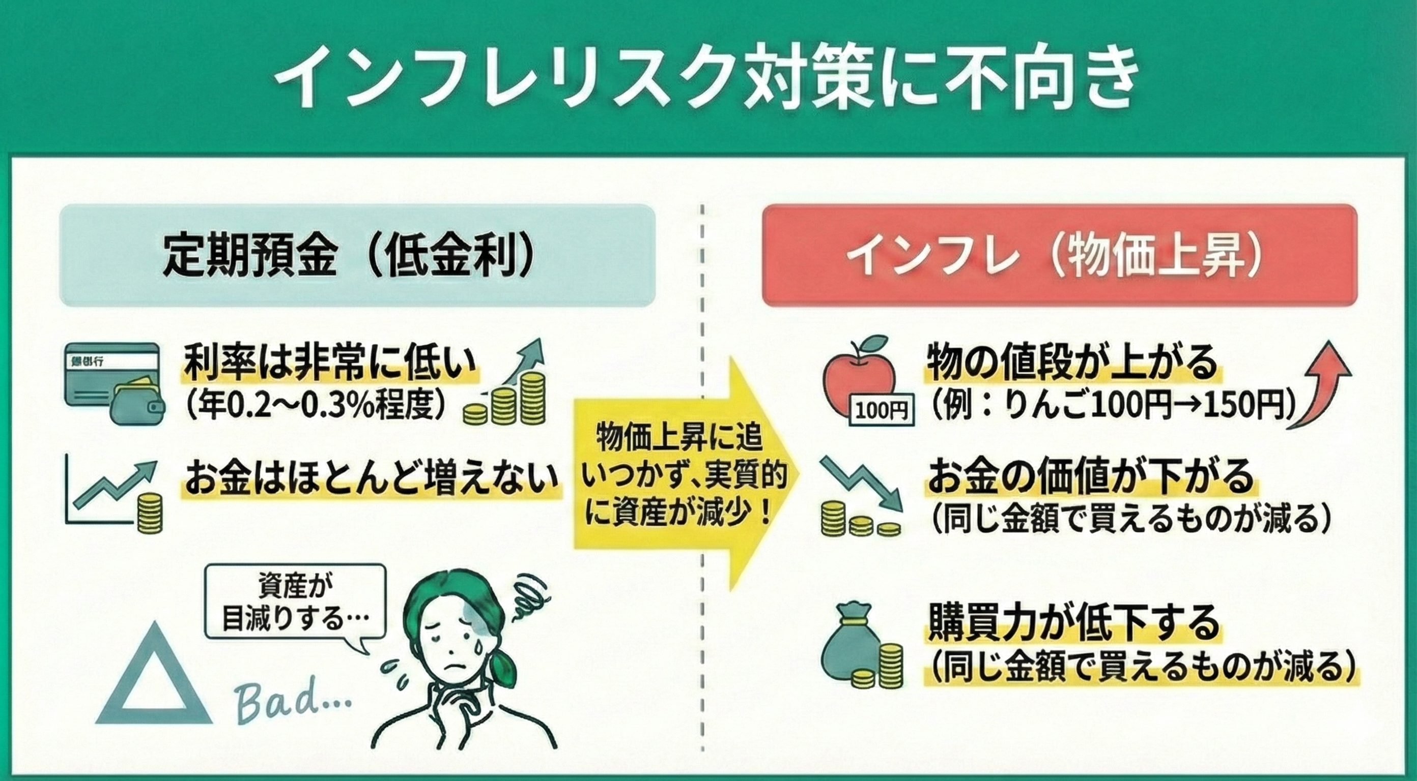 つまり、資産のすべてを定期預金にしていると、将来インフレが進行した場合、実質的に資産価値が目減りする可能性があります。