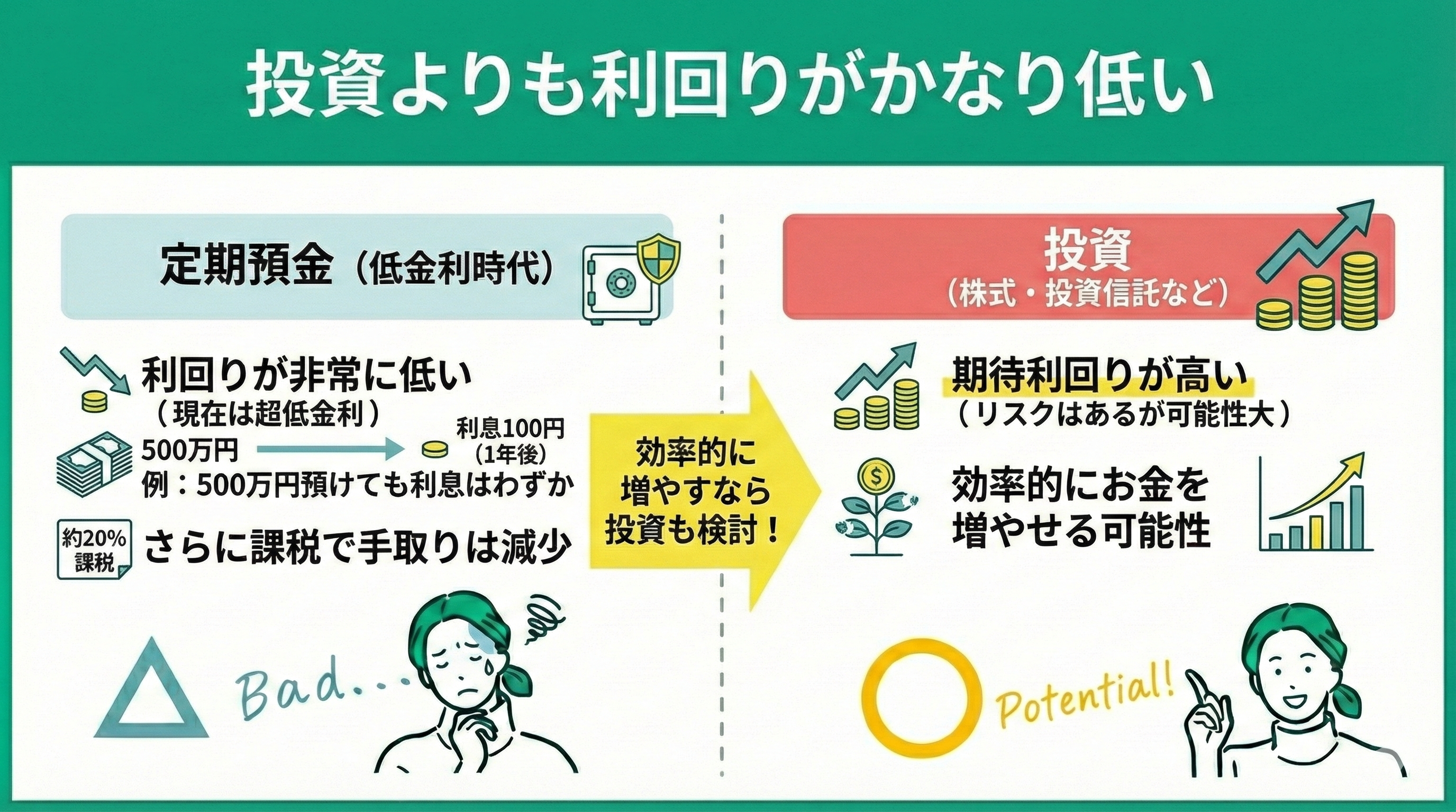 定期預金は、元本が保証されているという大きな安心感がある一方で、現在の低金利下では資産を大きく成長させる力には欠けます。