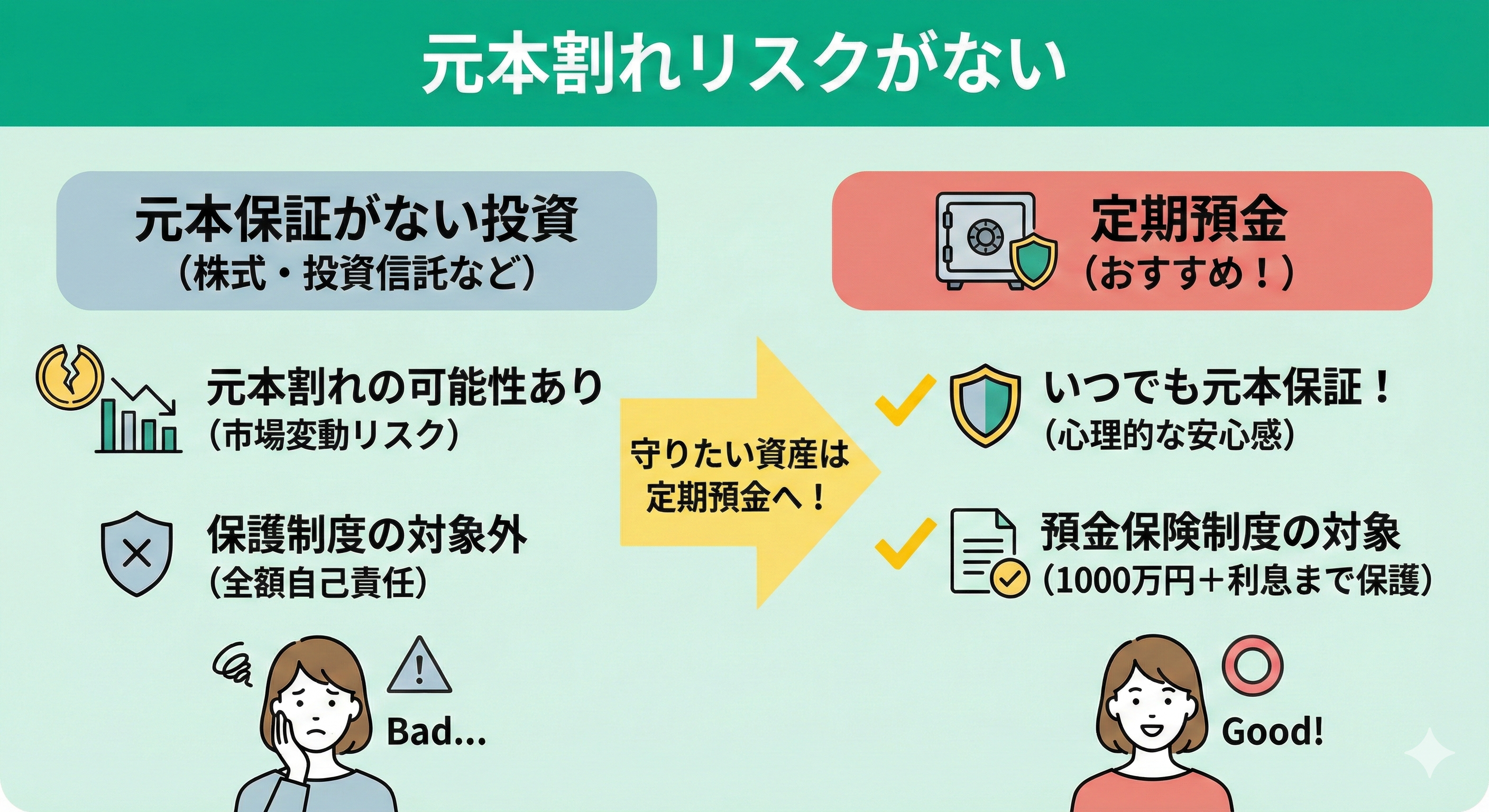 いつでも元本が保証されている定期預金を資産にうまく組み込めば、資産をまもれるため心理的な安心感が得られます。