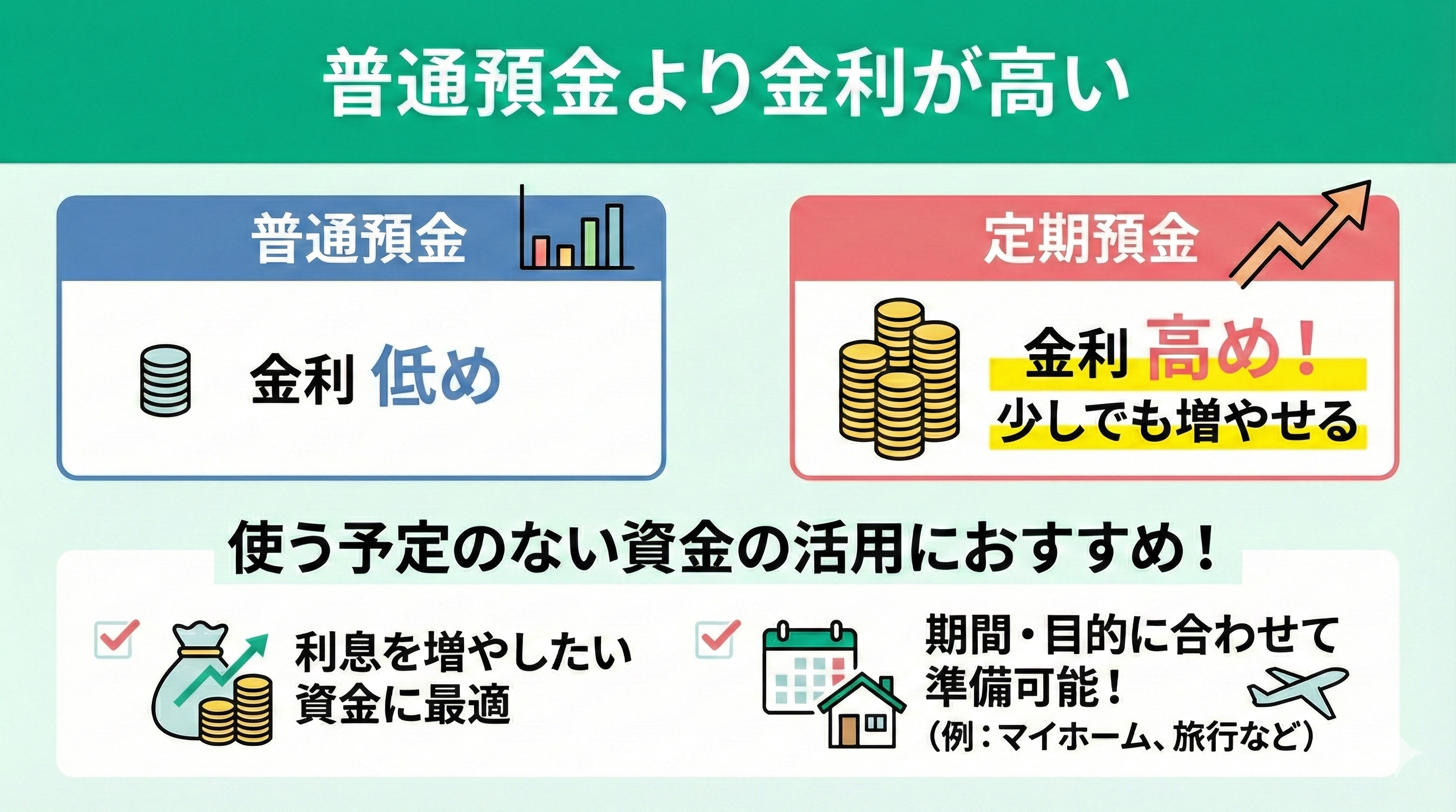 預金の利回りは金融機関によって異なりますが、使う予定がない資金を利用して少しでも利息を増やしたい場合は、定期預金を検討するのも1つの方法です