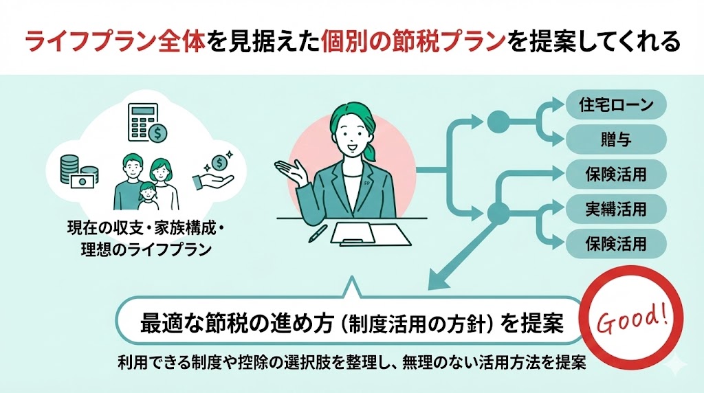 ライフプラン全体を見据えた個別の節税プランを提案してくれる