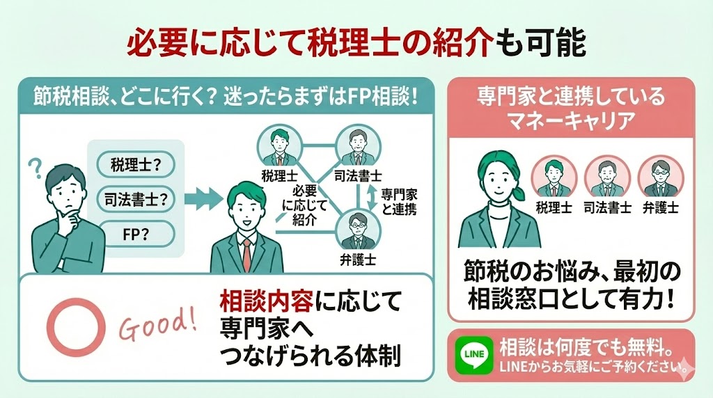 FP相談では、必要に応じて税理士の紹介も受けられる場合があります。