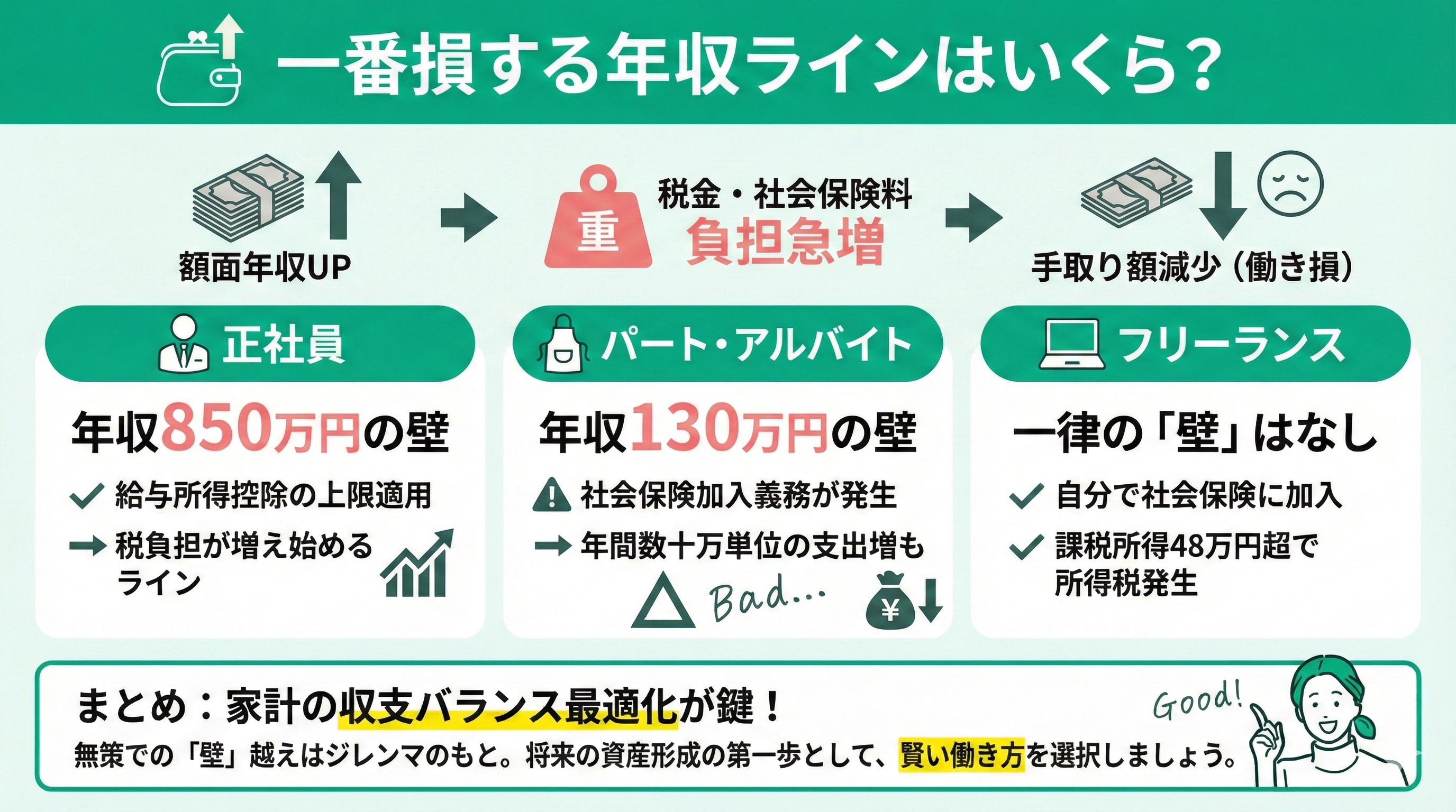 せっかく一生懸命働いても、税金や社会保険料の負担が急に増えて、結果的に「手取り額が減ってしまう」のは非常にもったいないことです。いわゆる「働き損」を避けるためには、ご自身のライフスタイルに合わせた特定の年収ラインを正しく把握しておくことが欠かせません。