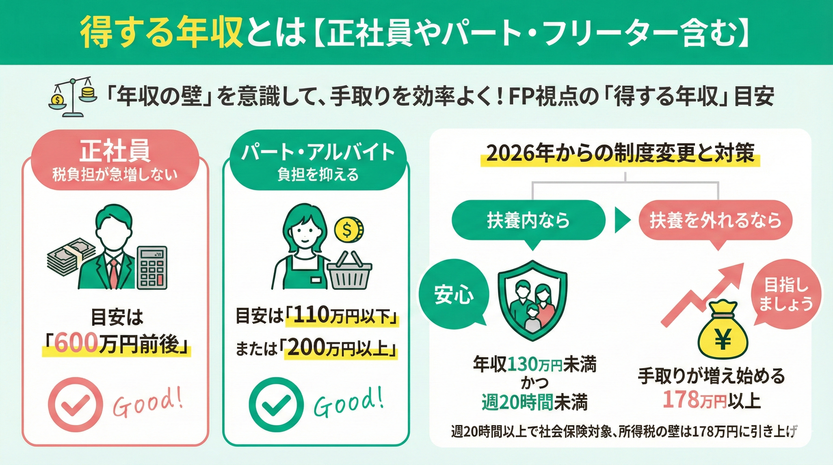 2026年は制度が変わり、週20時間以上で社会保険の対象となる一方、所得税の壁は178万円に引き上げられました。そのため、扶養内なら年収130万円未満かつ週20時間未満が安心です。逆に扶養を外れるなら、手取りが増え始める178万円以上を目指しましょう。