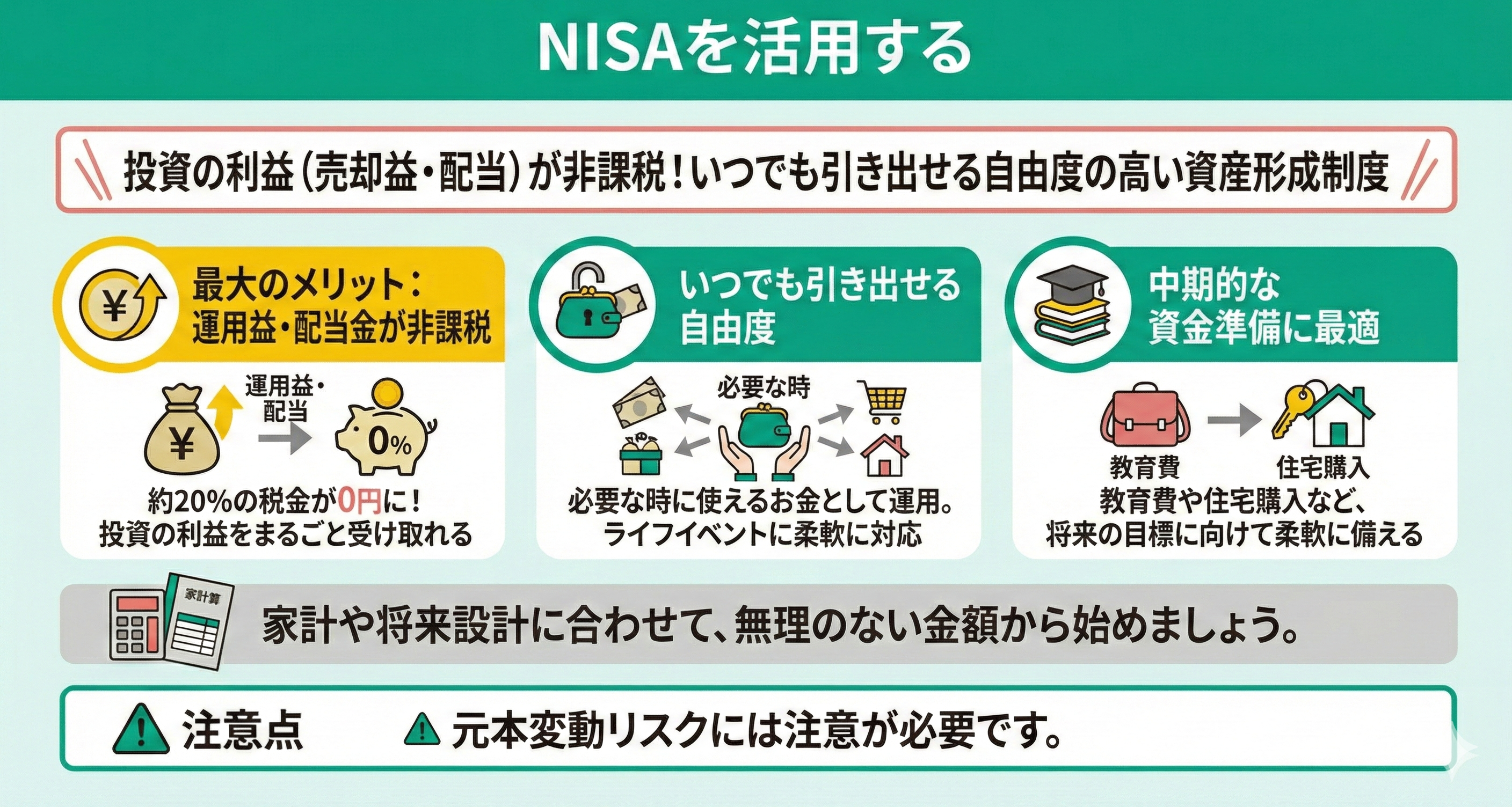 - NISA:運用で得た利益が非課税になり、効率よくお金を育てられます。
