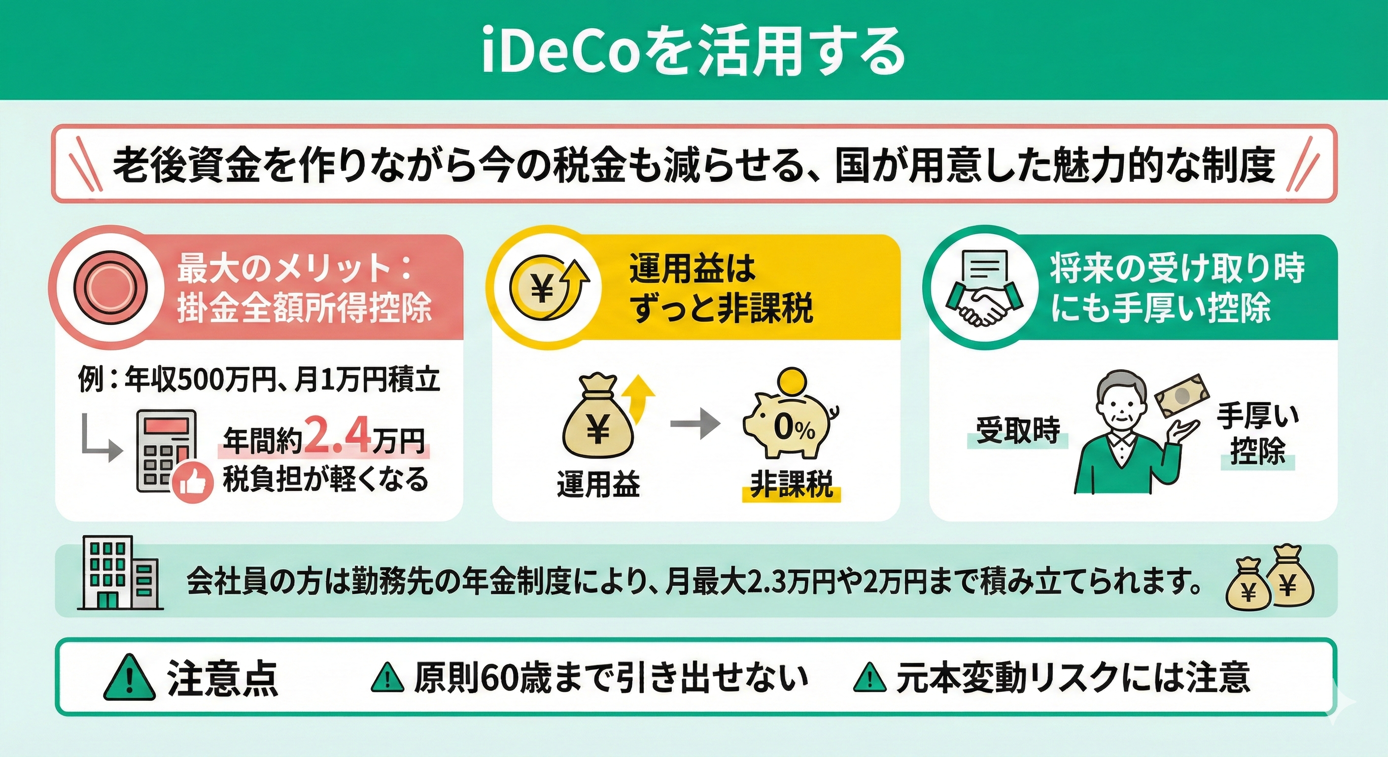ただし、原則60歳まで引き出せない点や元本変動リスクには注意が必要です。ご自身のライフプランに合わせて、無理のない金額から始めてみましょうね。