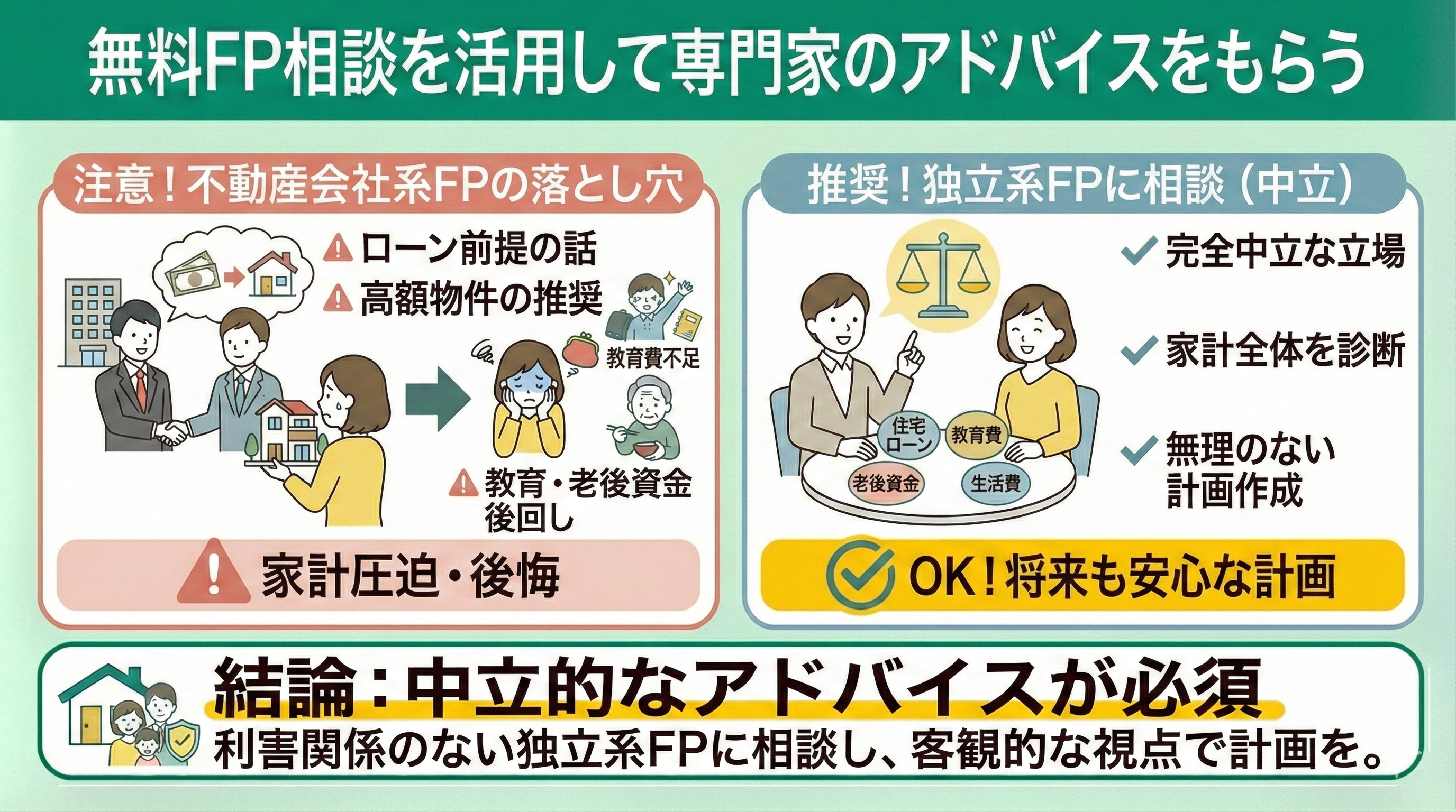 だからこそ、不動産と無関係な独立系のFPに相談し、住宅購入だけでなく家計全体のバランスを見たアドバイスを受けることが大切です。
